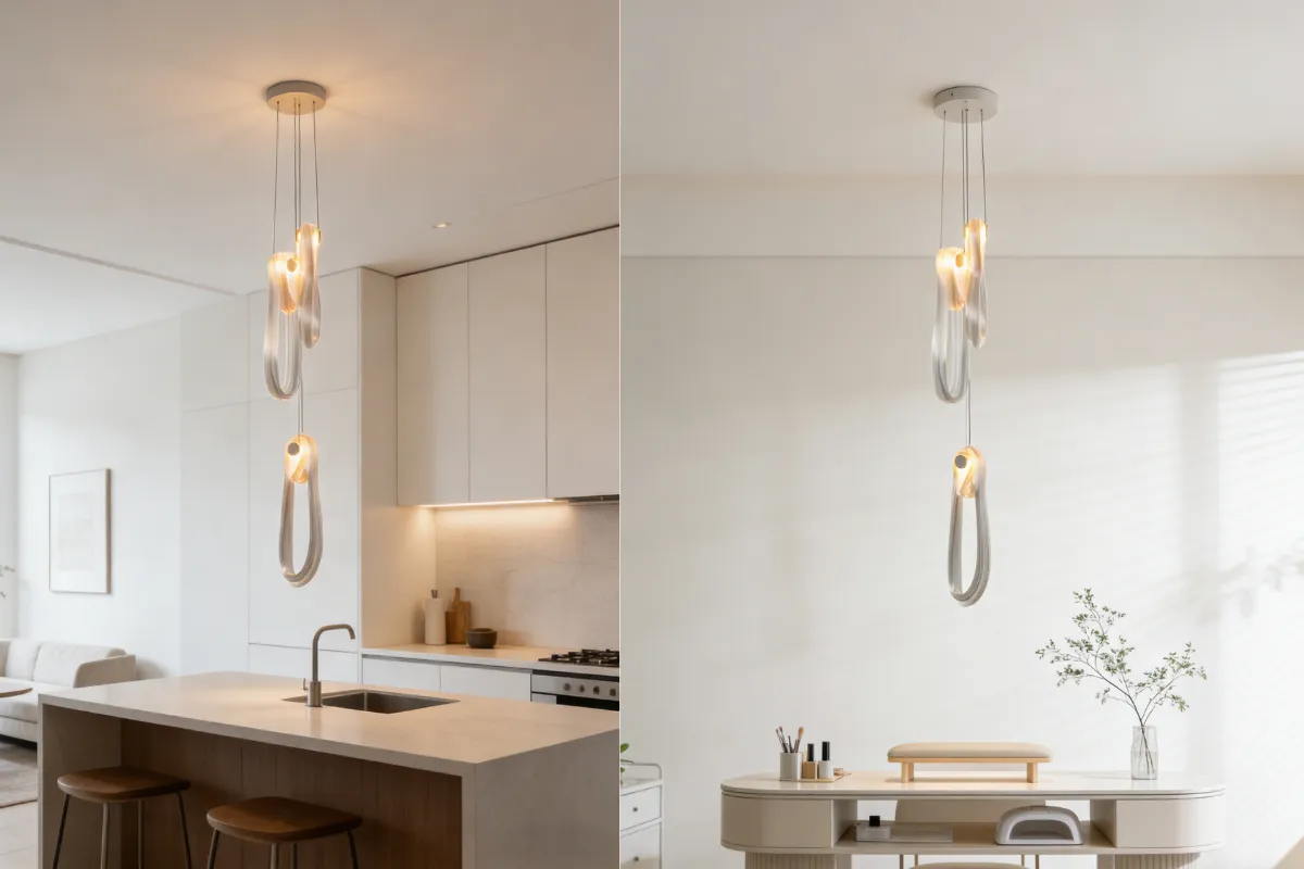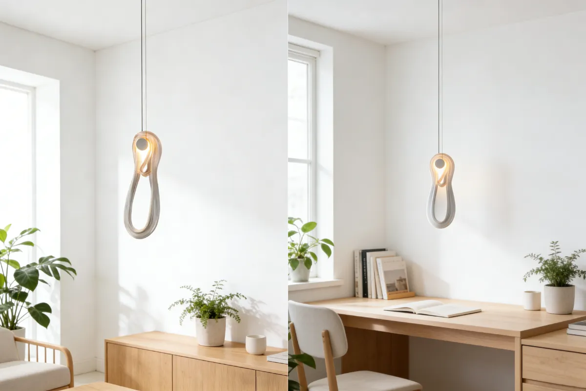 =Designerska lampa wisząca w kolorze białym Ta wyjątkowa lampa wisząca zachwyca organiczną, rzeźbiarską formą inspirowaną płynnym ruchem i naturalną lekkością. Delikatnie skręcona sylwetka tworzy efekt subtelnej pętli, która przyciąga wzrok nawet wtedy, gdy lampa jest wyłączona.