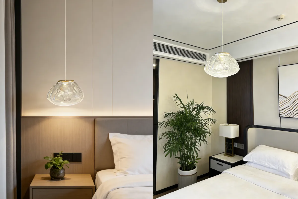 Strukturalne szkło delikatnie rozprasza światło, tworząc miękką i nastrojową atmosferę. Refleksy widoczne na powierzchni klosza dodają wnętrzu głębi i elegancji.